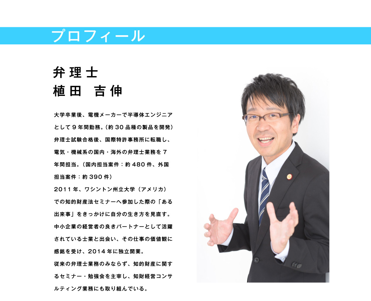 オリジナル製品で売上UPを目指す中小企業、あるいは、これから新規事業を始めようとするベンチャー企業を知財の側面から徹底的にサポートすることを事業の核とし、この事業活動で得られたノウハウを中堅企業、大手企業の知的財産の権利化推進にも活かせるように活動している。