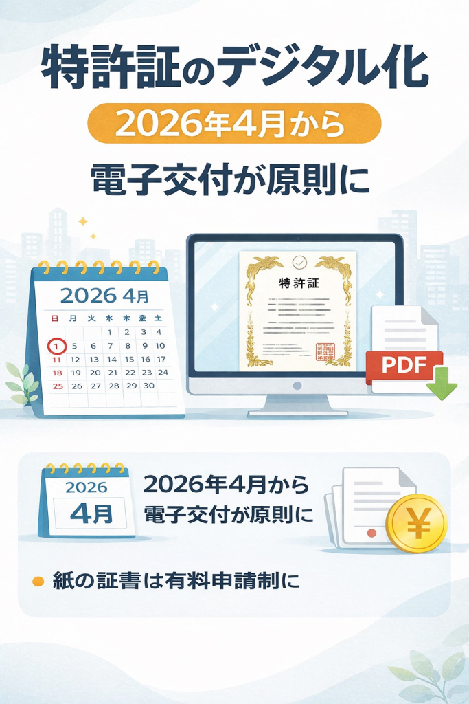 令和8年(2026年)4月1日以降に特許査定された案件については、原則「デジタル特許証(電子特許証)」の交付になります。