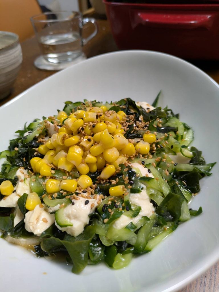 豆腐、わかめ、きゅうり、コーンのシンプルなサラダですが、